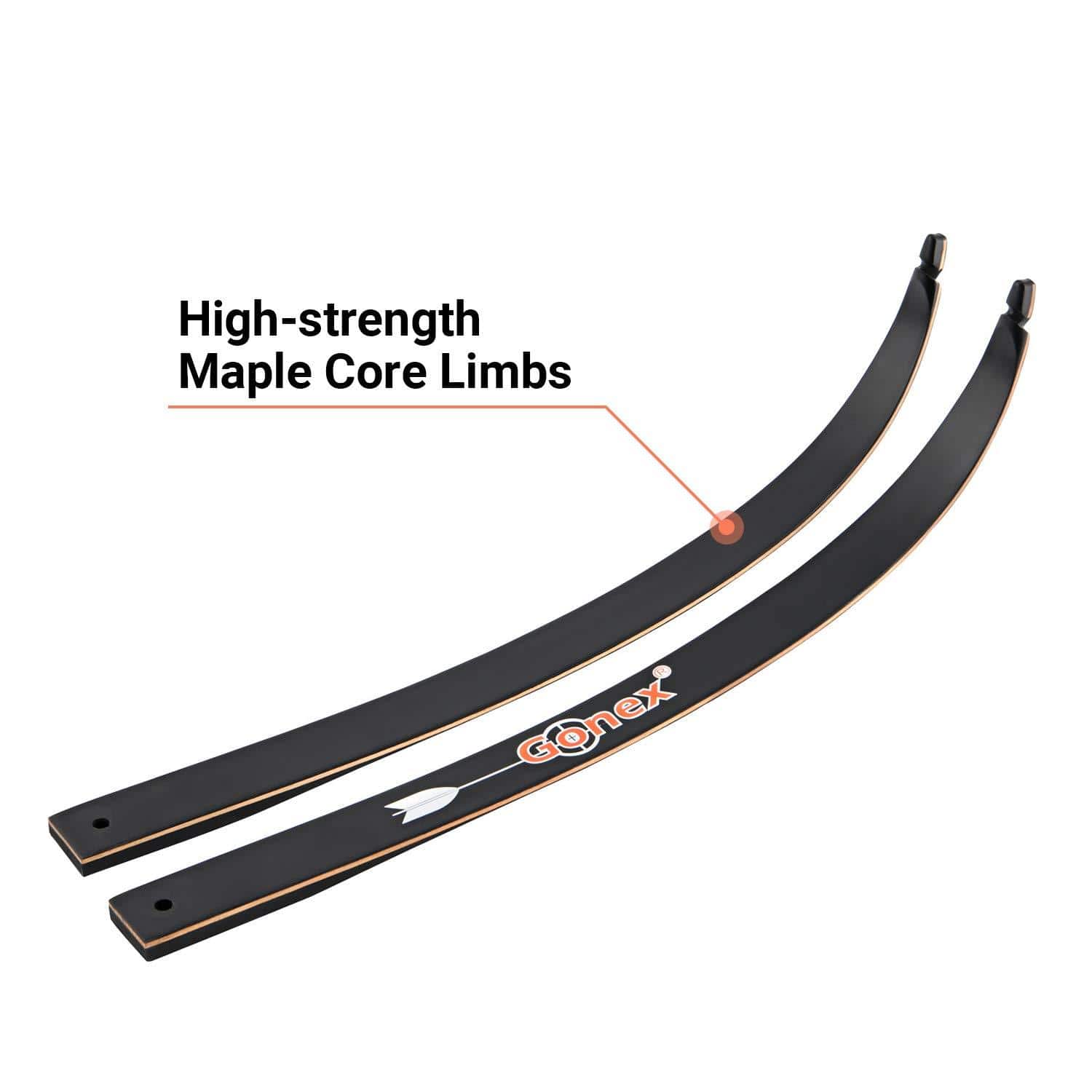 - [MAPLE FIBERGLASS LIMB ] The hunting bow limbs are well made with multiple layers of fiberglass maple material ,which has uniform smooth texture,hard,no knobby and bent,preforms well with metal riser that has rubber grips, more sturdy ,lighter ,easier to adjust than compound bow.Very sturdy and designed for beginners.
