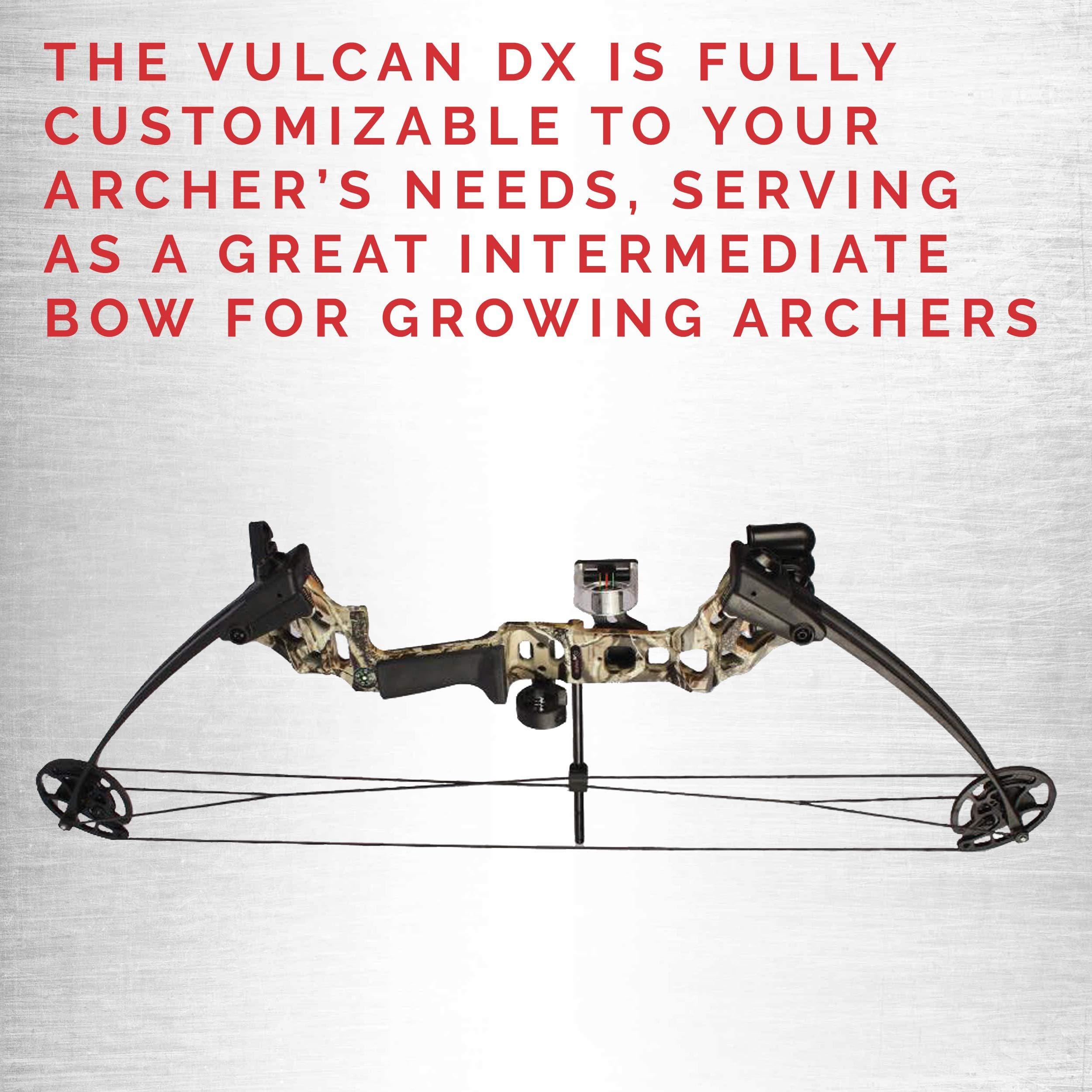 Details: The SA Sports Vulcan DX serves as a great intermediate bow for growing archers. It features an adjustable draw weight and draw length to accommodate your young or intermediate archer as they learn. The draw weight ranges from 15 to 45 pounds, and the draw length can be adjusted from 21 to 27 inches. The Vulcan DX features a camo riser, black fiberglass limbs, machined cams, a cable guide rod, cable slide, and a brush style arrow rest. This set comes with a 2 piece quiver with a hood and arrow retainer that mounts to the riser with bolts. The quiver has a 4 arrow capacity. The 3 sight pins are adjustable and easy to see in variable color neon. The Vulcan DX is fully customizable to your archer's needs, making it a favorite for youth and casual archers that are advancing in the sport. Fully adjustable draw weight ranges from 15 to 45 pounds; accommodates right handed archers Customizable draw length from 21 to 27 inches; includes a 2 piece quiver with 4 arrow capacity Equipped with a camo riser, machined cams, a cable guide rod, cable slide, and fiberglass limbs Sights feature 3 adjustable pins in easy-to-see variable color neon; includes brush style arrow rest This compound bow is best suited for growing youth, intermediate, and casual archers Comfort grip 3 point sight