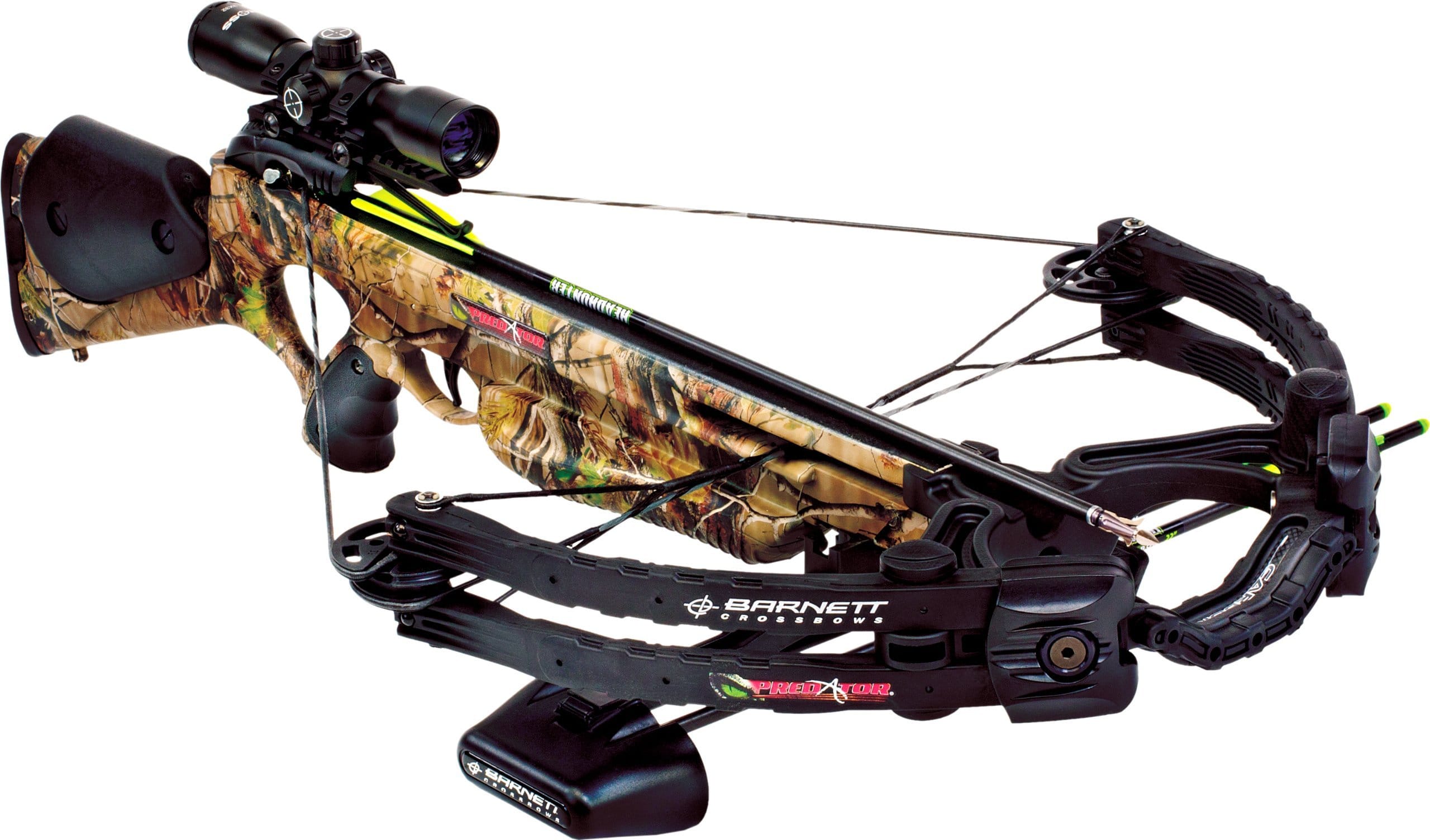 Details: The first patented crossbow of its kind, the Predator's pioneering design offers a shoot-through foot stirrup, increasing the power stroke to 15 inches, while the 175-pound draw weight produces speeds up to 375-feet-per-second. The Predator features Barnett's new AVI limbs combined with a re-designed, high-velocity cam and cable system. Built on the same framework that gave the immensely popular original Predator its remarkable velocity, the Predator 375 replaces the prior riser with a strong, lightweight carbon riser to improve balance and feel with every shot. This kit also includes a quiver, Three 22-inch arrows, and illuminated 3x32-millimeter scope.