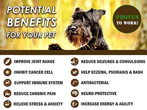 It can inhibit cancer cell growth, strenghten your pet`s immune system, improve her heart health and overall organ function, has antibacterial effect, is neuro-protective, can reduce chronic pain, improve joint range and motion, help arthritis, increase energy and agility, relieve stress & separation anxiety, help with seizures and convulsions, alleviate the symptoms of eczema, psoriasis, dry nose, acne and dog rash, thicken the fur texture, prevent dog dandruff and much more