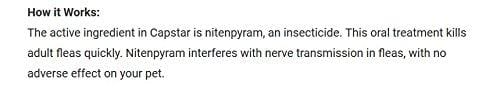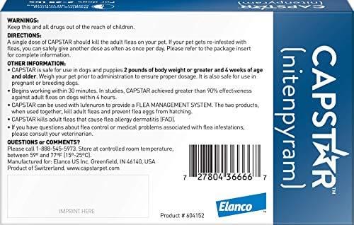 Details: Product Description Capstar (nitenpyram) is a fast-acting flea treatment tablet for use in dogs and cats that starts killing fleas in only 30 minutes. A single dose of Capstar kills 90% of adult fleas within 4 hours for dogs and 6 hours for cats, ridding your pet of these pesky parasites. Capstar is for dogs, puppies, cats, and kittens 2 pounds of body weight or greater and 4 weeks of age or older. Key Features • One convenient tablet starts killing fleas within 30 minutes • Treat flea infestations fast for every cat and dog in your home • Kills adult fleas before they can lay eggs and start an infestation • One tablet kills 90% of fleas in 4 hours for dogs and 6 hours for cats • Safe to administer one tablet per day until flea infestation is resolved • Capstar kills adult fleas that may cause flea allergy dermatitis. Capstar is for dogs, puppies, cats and kittens 2 pounds of body weight or greater and 4 weeks of age and older. Dosing Capstar is available in 2 dosages: • Cats and dogs from 2 to 25 pounds (11.4 mg) • Dogs from 25.1 - 125 pounds (57 mg) Administration To give Capstar tablets, place the oral tablet directly in your pet’s mouth or hide it in food. Use with Other Medications If your pet is currently receiving a monthly or longer-lasting flea preventative medication but still becomes infested with fleas, it is safe to administer Capstar to address a flea infestation. Capstar may also be used together with other products, including heartworm preventatives, corticosteroids, antibiotics, vaccines, deworming medications, and shampoos. Re-infestations Capstar kills adult fleas on dogs and cats, offering quick relief for your furry friend. While Capstar works fast to kill adult fleas and alleviate a current infestation, a subsequent preventative solution is recommended to prevent future re-infestations from any existing flea eggs and larvae in the environment. If you notice more fleas have found their way onto your dog or cat in the days following treatment, continue treating your dog or cat with Capstar with up to one dose per day. Important Safety Information Capstar is safe to use in puppies and kittens 4 weeks of age and older, and 2 pounds of body weight or greater. Always read, understand, and follow the label and use directions.