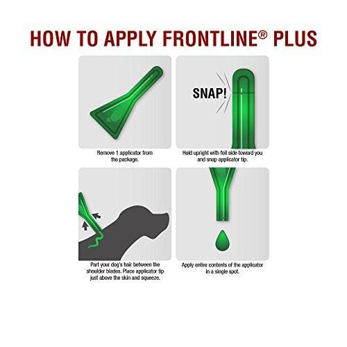 Details: Frontline products are highly recommended by veterinarians for flea and tick control for dogs. For dog owners who want long-lasting, fast-acting flea, tick, and chewing lice control, Frontline Plus guarantees control on dogs aged 8 weeks and older. You only have to apply Frontline Plus once a month, so a 6-dose supply will provide you with up to 6 months of convenient, highly effective flea, flea egg, chewing lice, and tick control. Frontline Plus kills up to 100% of existing fleas in less than 24 hours and continues, on a single dose, killing them for at least an entire month. Its special ingredient also kills flea eggs and larvae, which, in effect, prevents the development of new fleas. It destroys all stages of 4 major ticks, including ticks that may carry Lyme disease, which provides your dog and your family with additional protection. Frontline Plus is waterproof, so your dog will still be protected if it bathes or goes for a swim. Merial backs up Frontline Plus with a limited Satisfaction Guarantee. Using Frontline Plus is a simple 3-step process. First, remove the applicator from the child-resistant package, use scissors or just lift the plastic tab to expose the foil, and then peel down. Secondly, open the applicator, hold it upright, and snap the tip away from your face and body. Finally, apply Frontline Plus by placing the applicator tip through your dog's hair to the skin between the shoulder blades. Squeeze the applicator to apply the entire dose to a single spot on the dog's skin.