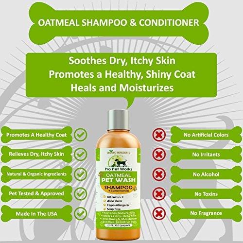 Details: Pro Pet Works 5 In 1 Oatmeal Pet Wash is specially formulated for pets with flea bite, grass and food allergies as well as dry, itchy, sensitive skin. The combination of organic aloe vera extract, organic almond oils and Vitamins E, A & D will not irritate your pets eyes or nose while bathing. Some shampoos can strip your pet of their natural minerals and coat oils, but Pro Pet Works won't strip the coat of your dog's natural oil production. Meant for dogs and cats 12 weeks and over.