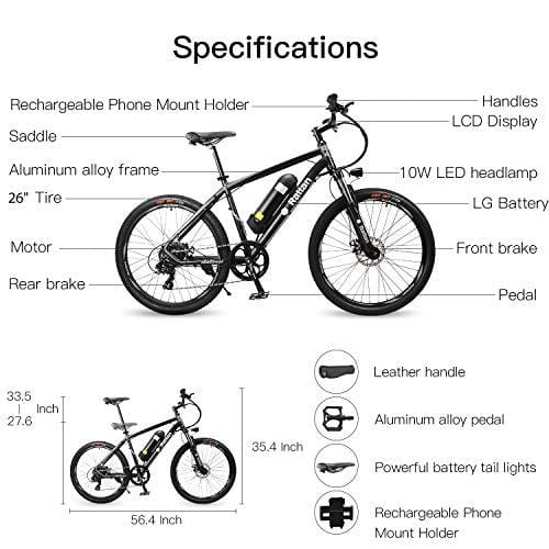 • 【High-quality Electric Mountain Bike】- The Electric Bike use 100% aluminum alloy frame, electrostatic baking varnish and hydroforming technology. These material and technologies make the electric bicycle light, strong and designed to last. This wonderful E-bike also have quality anti-slip wear resistant tire tire and shock-absorbing front forks, which have a high grade cushioning effect and are very stable.