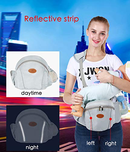 Details: -Base Information The weight of baby hip seat carrier is approx. 1lb. Suit for growing baby who is under 36 months and weight between 8 and 45lbs. -Safe Material The baby hip seat carrier is made of skin friendly 100% polyester fiber and breathable polypropylene material. No harm for growing baby and parent to use and can be cleaned easily. -Upgraded Version The storage space ande sturdy back buckle and the soft inner cushion make the baby safe and the parents more comfortable. -Ergonomic Design Ergonomic hip seat perfectly adapts to your growing baby. The soft inner allows baby to be in a natural sitting position. -Night Reflective Strip Reflective strip attached. Keep your baby safe in the night.