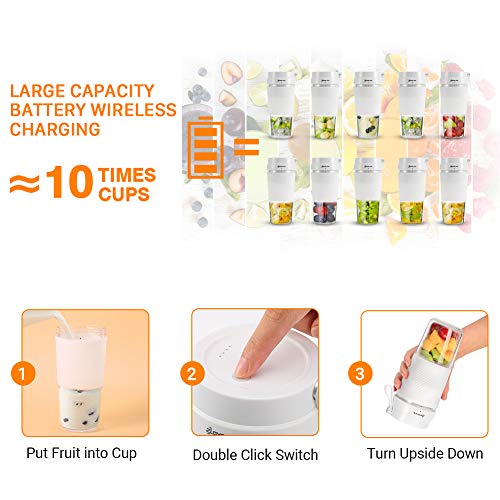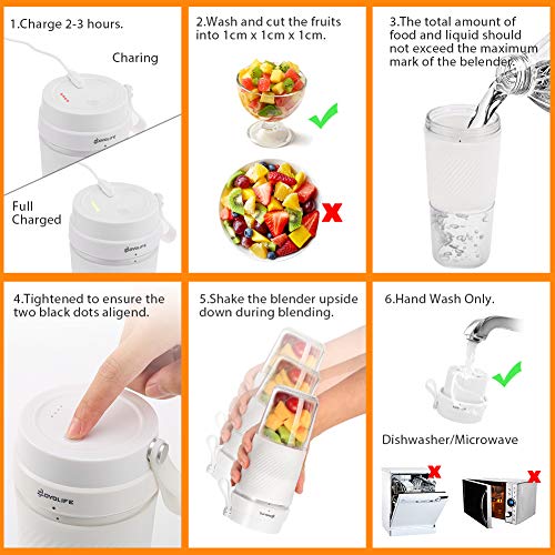 Details: A Healthy Lifestyle Starts with a Cup of Fresh Juice Everyday! If smoothies and protein shakes are a staple in your diet, life just got a little easier. The ZOYOLIFE Personal Blender lets you blend and run. Take It Wherever You Go Tired of lugging around extra cups while you're on the go? You're in luck. The ZOYOLIFE Personal Blender provides ultimate drink versatility and portability. Our Personal Blender is an integrated cup juice extraction, no need to bring an extra cup. It lets you drink straight from the jar and fits in most car cup holders. Extremely compact, it’s perfect for traveling with you to work, games or sporting events and it’s ideal for small living spaces. Steps to use the personal blender: 1) Cut your favorite fruit into small pieces - 1*1*1 inch Tips: Ice tube should be frozen into 1 inch and ingredient should be cut in 1 inch. 2.Fill water and fruit into portable blender until the maximum line. Tips: Do not exceed the maximum line.(400ml) 3.Only Tighten the lid to ensure two black dot aligned.Tap twice quickly on button(in short time) can switch on the smoothies blender, ensure the maximum safety. Tips: If the interval between two click is too long, not continuous or not quickly enough, the product will not work. 4.Shake the blender for your delicious smoothies, mixer, juice! Tips: It is auto off after 20 second in case you forget to turn it off which help save energy and extended battery life. Tips: Please charge portable blender before your first use. Please put this product beyond the reach of children. Please don't use fruit blender when charging. Please don't pour hot liquids over 80 degree(176℉), which will cause damage or leakage. Please don't put smoothie blender into a dishwasher. To get more information, please read user manual.