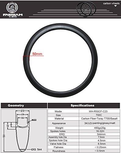Fasteam Carbon Fiber Road Bike Wheels 700C Clincher Wheelset 50mm Matte 23 Width 20/24h for Shimano