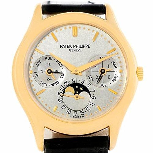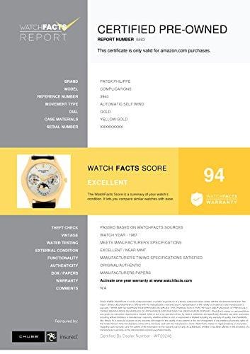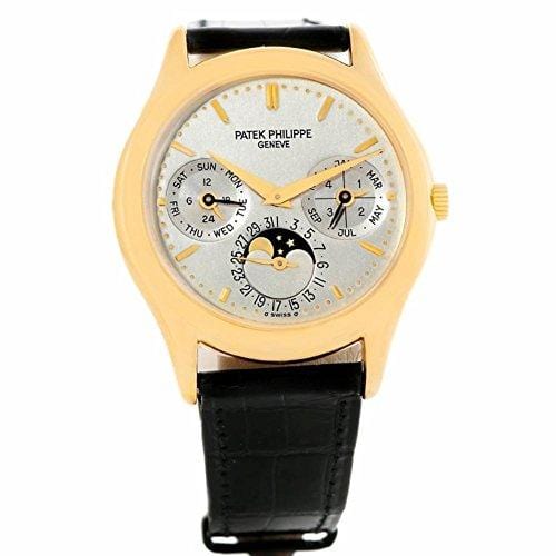 Details: PATEK PHILIPPE PERPETUAL CALENDAR GRAND COMPLICATIONS MENS 18K YELLOW GOLD WATCH. MODEL 3940. AUTOMATIC MOVEMENT. RHODIUM PLATED, FAUSSES COTES DECORATION, STRAIGHT-LINE LEVER ESCAPEMENT, GYROMAX BALANCE ADJUSTED TO HEAT, COLD, ISOCHRONISM AND 5 POSITIONS, SHOCK ABSORBER, FREE-SPRUNG SELF-COMPENSATING FLAT BALANCE SPRING, 22K GOLD MICRO-ROTOR. CALIBER 240 Q. 27 JEWELS. 18K YELLOW GOLD CASE 36.0 MM IN DIAMETER. CONCAVE LUGS, SNAP-ON CASE BACK. SAPPHIRE CRYSTAL. MATTE SILVER WITH APPLIED YELLOW GOLD FACETED BATON INDEXES, OUTER ENGRAVED MINUTE DIVISIONS, SUBSIDIARY DIALS FOR THE DAYS OF THE MONTH, OF THE WEEK, THE MONTHS, THE 24 HOURS AND LEAP YEAR, APERTURE FOR THE MOON PHASES. YELLOW GOLD DAUPHINE HANDS. 18K YELLOW GOLD CONCAVE BEZEL. BLACK LEATHER STRAP WITH 18K YELLOW GOLD DEPLOYANT BUCKLE.. SKU 8918P. BUY WITH CONFIDENCE KNOWING EACH TIMEPIECE GOES THROUGH THE SAME RIGOROUS 31-POINT INSPECTION. REST ASSURED ONLY AUTHENTIC PARTS STRAIGHT FROM THE MANUFACTURER ARE USED. THE CERTIFIED PRE-OWNED PROGRAM ON AMAZON ENSURES PEACE OF MIND AND TRANSPARENCY VIA STANDARDIZED REPORTS AND A 1 YEAR WARRANTY PROVIDED BY WATCHFACTS.