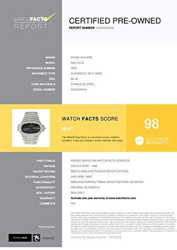 Details: PATEK PHILIPPE, NAUTILUS, 3900, AUTOMATIC-SELF-WIND, NEW, PRODUCTION YEAR:1998, CASE MATERIAL: STAINLESS-STEEL, CASE DIAMETER: 32 MILLIMETERS, BEZEL MATERIAL: STAINLESS-STEEL, DIAL COLOR: BLUE, BAND MATERIAL: STAINLESS-STEEL, BOX ONLY, EXTERNAL CONDITION: LIKE NEW, BUY WITH CONFIDENCE KNOWING EACH TIMEPIECE GOES THROUGH THE SAME RIGOROUS 31-POINT INSPECTION. REST ASSURED ONLY AUTHENTIC PARTS STRAIGHT FROM THE MANUFACTURER ARE USED. THE CERTIFIED PRE-OWNED PROGRAM ON AMAZON ENSURES PEACE OF MIND AND TRANSPARENCY VIA STANDARDIZED REPORTS AND A 1 YEAR WARRANTY PROVIDED BY WATCHFACTS.