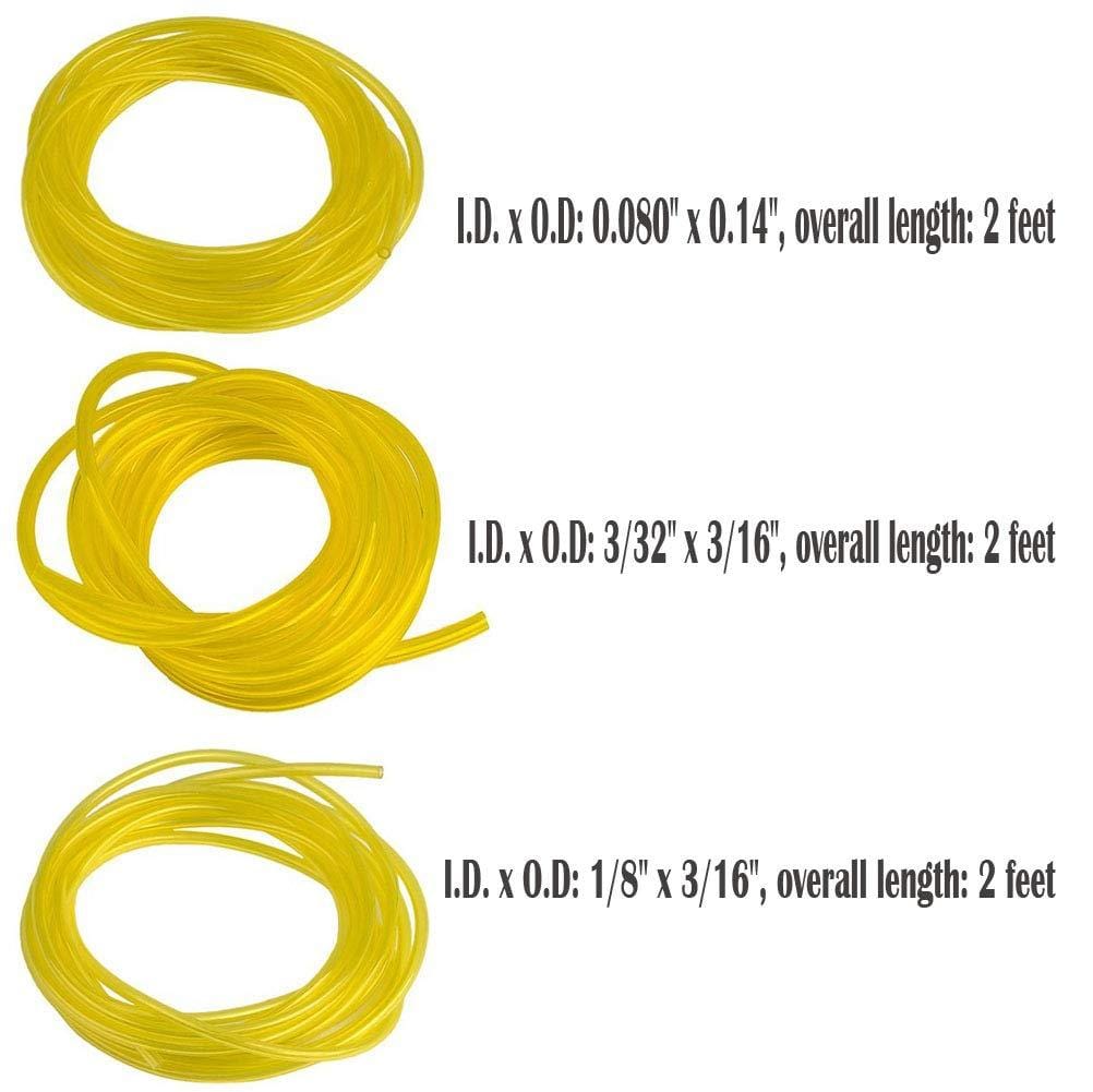 • 3 Sizes Yellow Hose for common 2 cycle small engine.High quality tygon petrol fuel gas lines for Chainsaws, Blowers, Pressure Washers, Weed Whackers and Trimmers and many other gas engine machines.(No compatible with greater than 10% ethanol fuel).The sizes of the hose are respectively:I.D. x O.D: 0.080"x 0.14", I.D. x O.D: 3/32" x 3/16",I.D. x O.D: 1/8" x 3/16"(verall length:2 feet each).