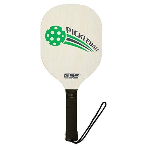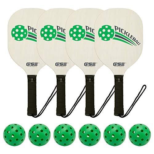 - Four standard size premium hardwood pickleball paddles have a cushion grip and wrist strap. Dimensions: 8" x 9" face, with a 5" handle.