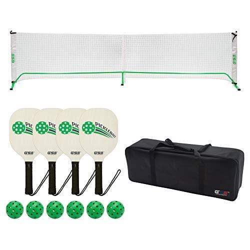 - The complete set includes a pickle net, steel support pole frame, 4 hard wood pickleball paddles, 6 official outdoor pickleballs, a heavy-duty nylon carrying bag, and assembly and rules instructions.