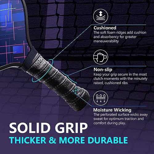 - 【Comfortable ergonomic grip】Pickle ball set is designed to be perforated, sweat absorbent, and cushioned. It can help users better grasp the grip and provide cushioning. 4.57" grip circumference allows enough room for maximum wrist snap for power and spin and range of motion in your wrist.