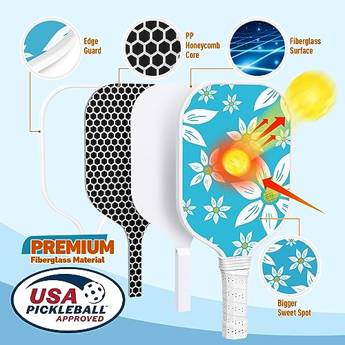 Pickleball Paddles, Blue Pickleball Set of 2 with 2 Fiberglass Surface Pickleball Paddles, 4 Balls, 1 Carry Bag, 2 Cooling Towels Racket with Ergonomic Cushion Grip for Intermediate Gift for Women Men