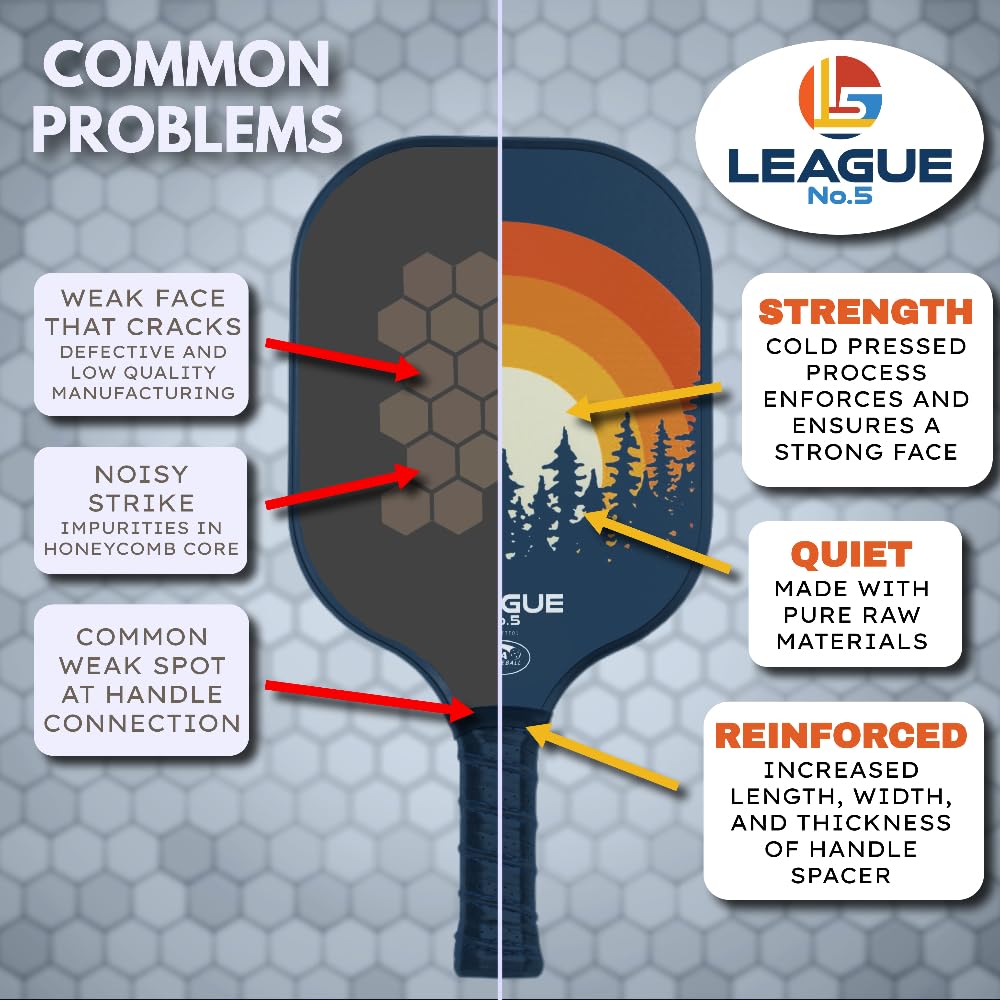 - {Worry Free Durability} We know the frustration of a cracked Pickleball paddle face, handles that break, and cheap grips. We have taken care of all of that. Our paddles are reinforced to provide extra strength at the handle connection point, designed with your most comfortable grip in mind, and using a cold press process to completely eliminate surface cracking. A gleaming fiberglass face and an intricate honeycomb composite core provide a fast and exhilarating experience on the court.
