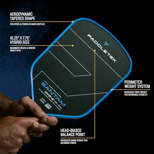 • Optimized Pro-Player Style Swing Weight, Twist Weight, & Balance: The Bantam GTO-C features a hybrid design with a unique tapered shape that enhances swing weight and power. The design maximizes the sweet spot location and creates a powerful and stable swing for players who need both power and control. Our 7.9 oz paddles deliver higher swing weight power and twist weight control than most competitors 8.3 oz heavier paddles.
