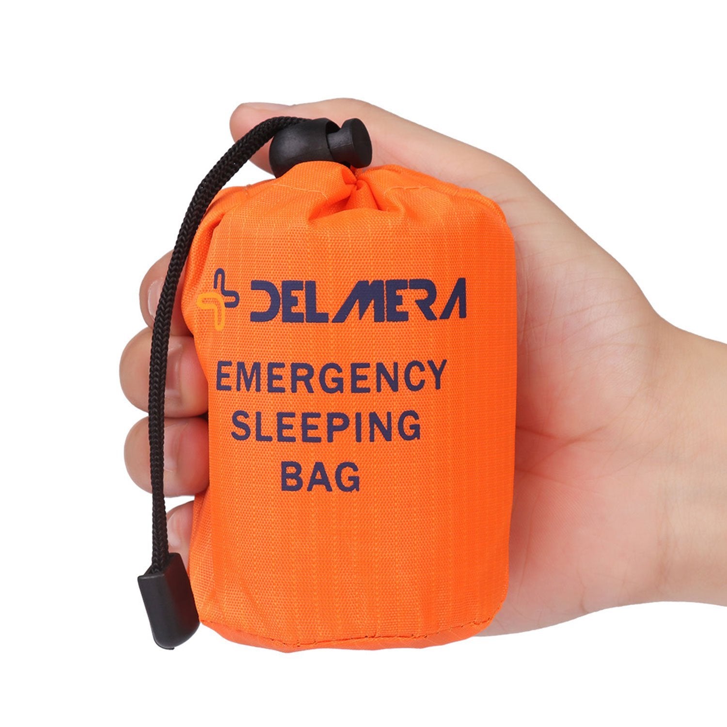 - ULTRA LIGHTWEIGHT & COMPACT SLEEPING BAG-Dimension: 3.08 ft x 6.73 ft(37*80.7 inches), enough to accommodate an adult; Lightweight at 4.6 oz, it's easy to carry. Small enough to fit in the palm of your hand, Delmera's Bivy survival sleeping bag comes rolled up inside handy nylon stuff drawstring bag sack so you can store it nearly anywhere. First aid sleeping bag is guaranteed, not easy to tear, good waterproof performance, strong wind resistance, strong insulation performance