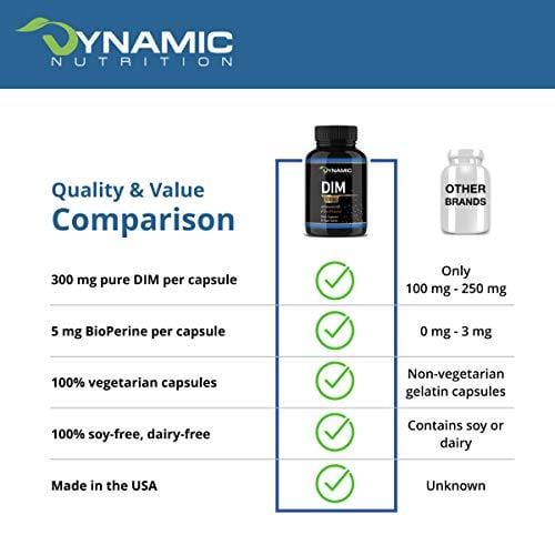 - EXTRA STRENGTH DIM: DIM Plus 300mg pure DIM per capsule ensures you get all you need in just one serving (2 month supply). Compare to other brands that only give you 100mg - 250mg per capsule. Plus, our diindolylmethane is pure, without fillers or mixed in with a secret "proprietary blend". Sourced from cruciferous vegetables like broccoli, kale, and cabbage.