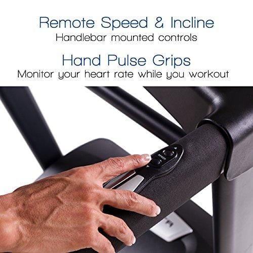 - Remote controls are conveniently located on the handlebars that adjust speed and incline