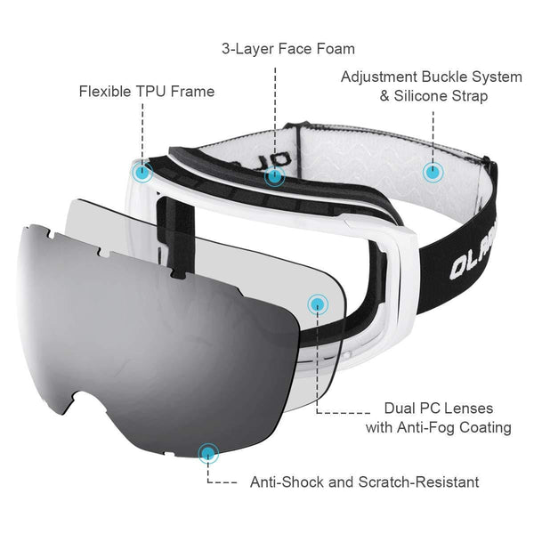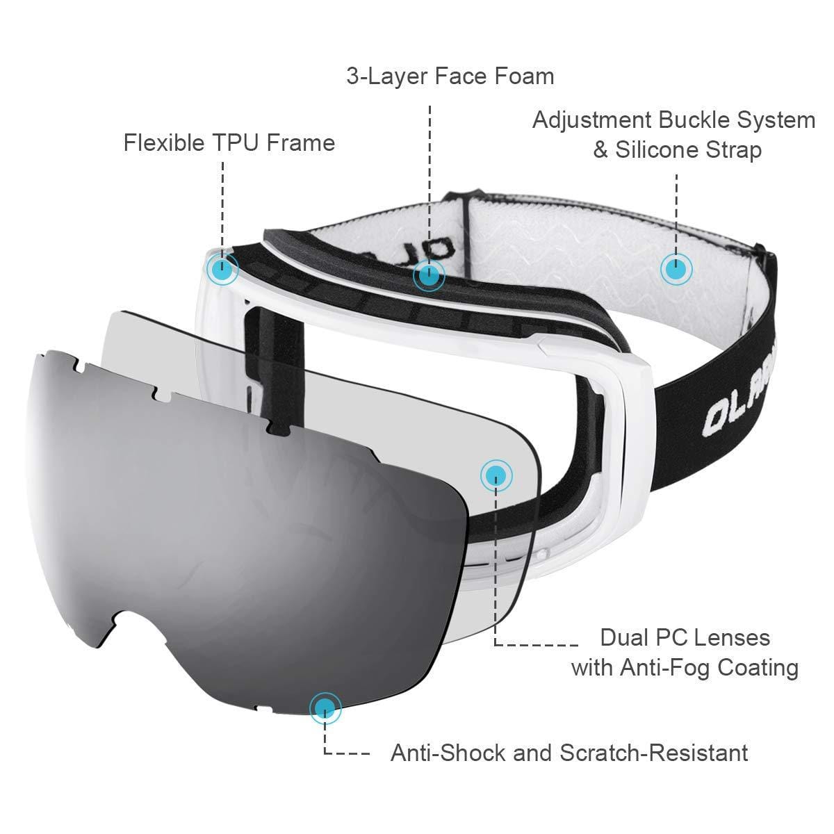 OlarHike Ski Snow Goggles for Men and Women, Anti-Fog Over Glasses Snowboard Goggles with UV Protection, Windproof Dual Lens Goggles for Skiing & Skating & Outdoor Sport, UV400