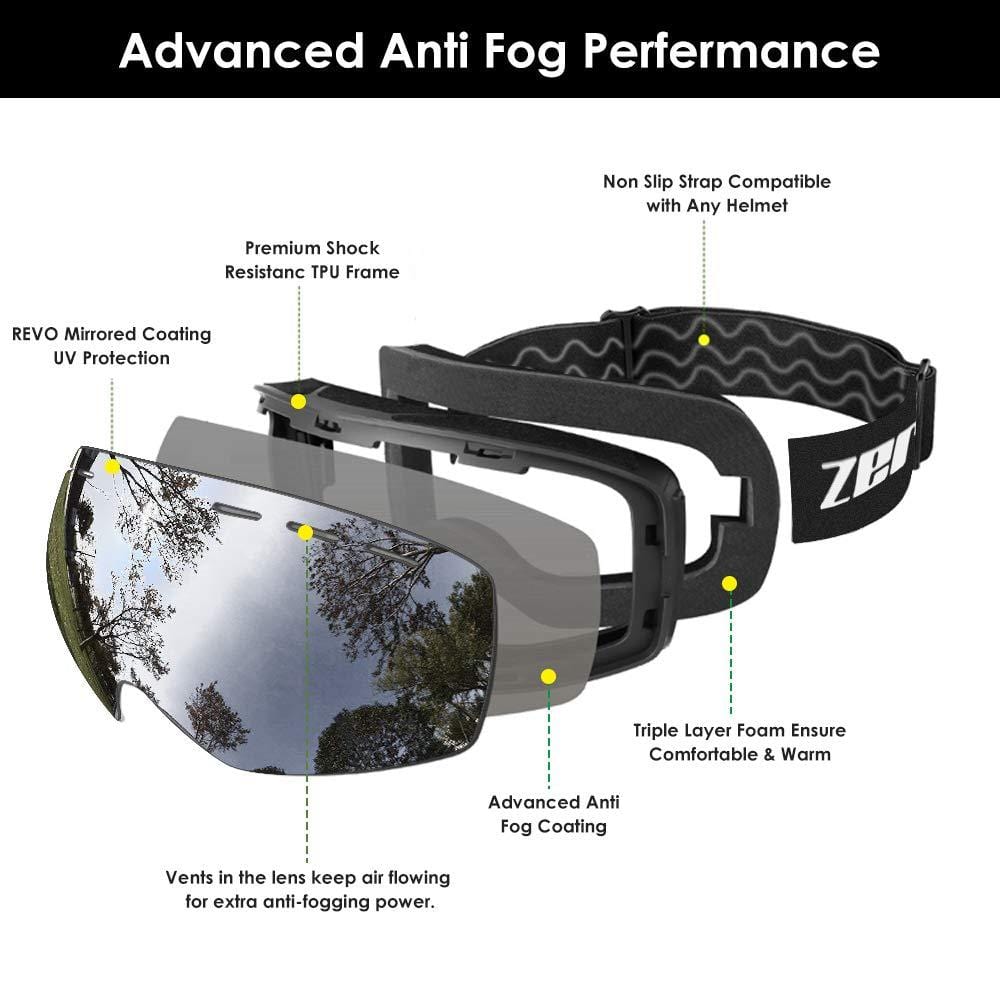 Zerhunt Ski Goggles, Snowboard Goggles Over Glasses, Anti Fog UV Protection Snow Goggles OTG Interchangeable Lens for Men Women Snowmobile, Skiing, Skating, Silver