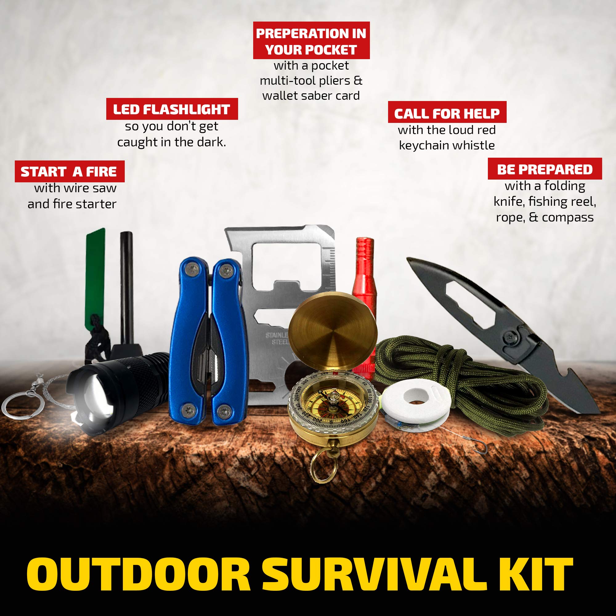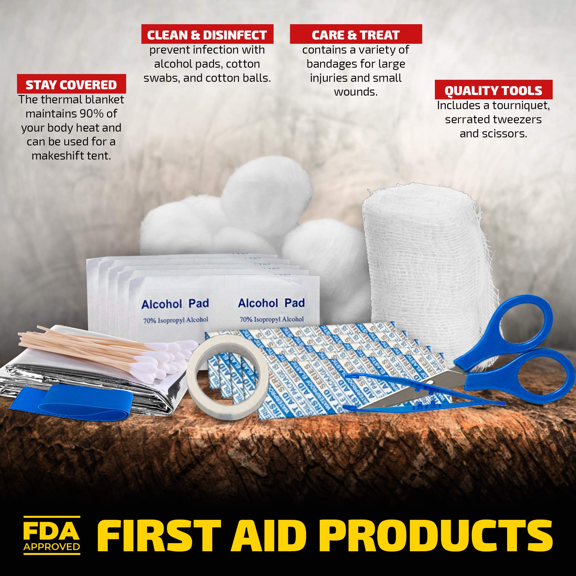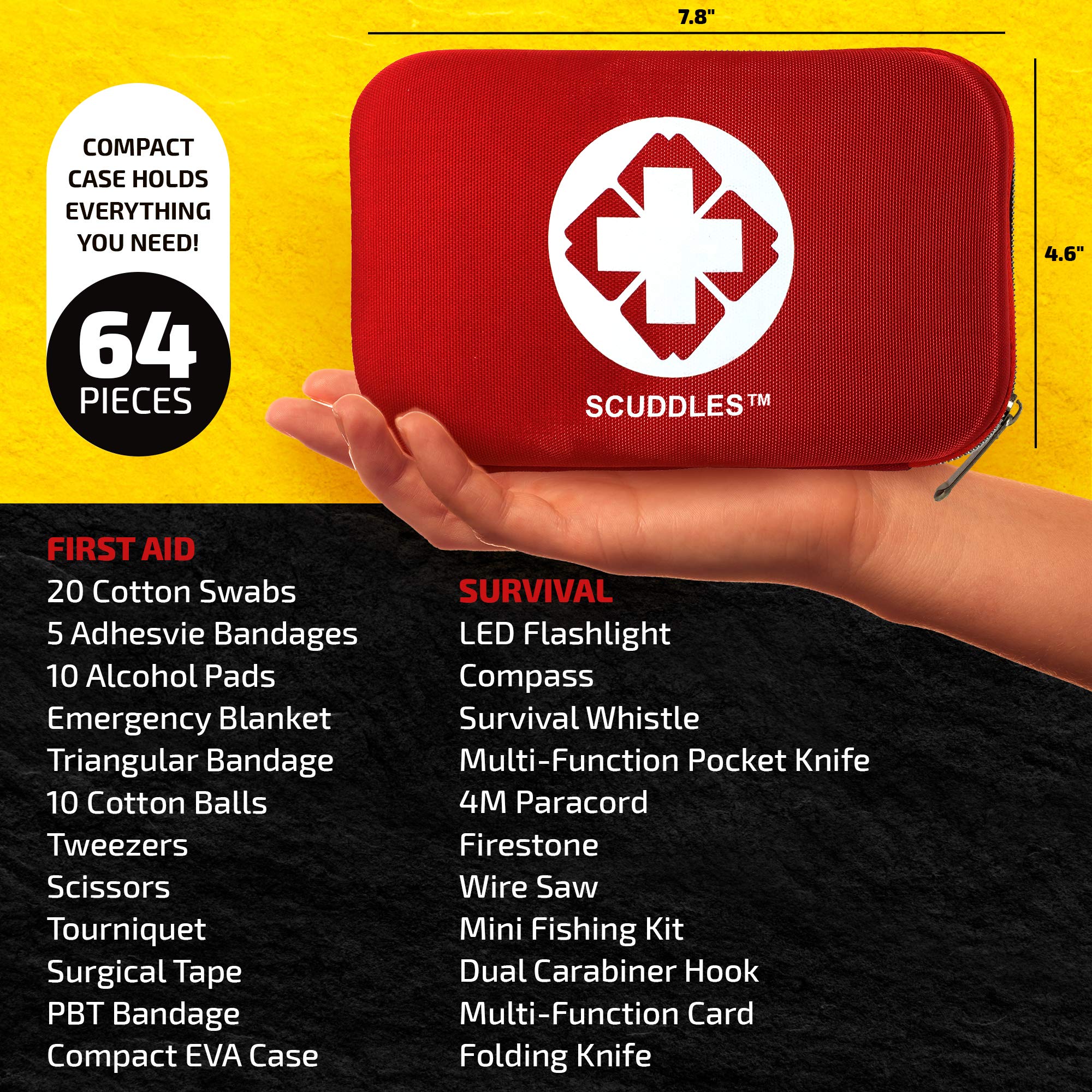 • βœ… π€π•πŽπˆπƒ ππŽπ“ ππ„πˆππ† 𝐏𝐑𝐄𝐏𝐀𝐑𝐄𝐃 - Scuddles First Aid Camping Kit is an effective and powerful set that comes with more than enough gauzes, alcohol, swabs, bandages, tourniquets and gloves so that you are really prepared for any type of emergency that may come your way. Popular outdoor survival necessities such as flashlight, compass, folding knife, fire starter, and much more is part of this important car kit.