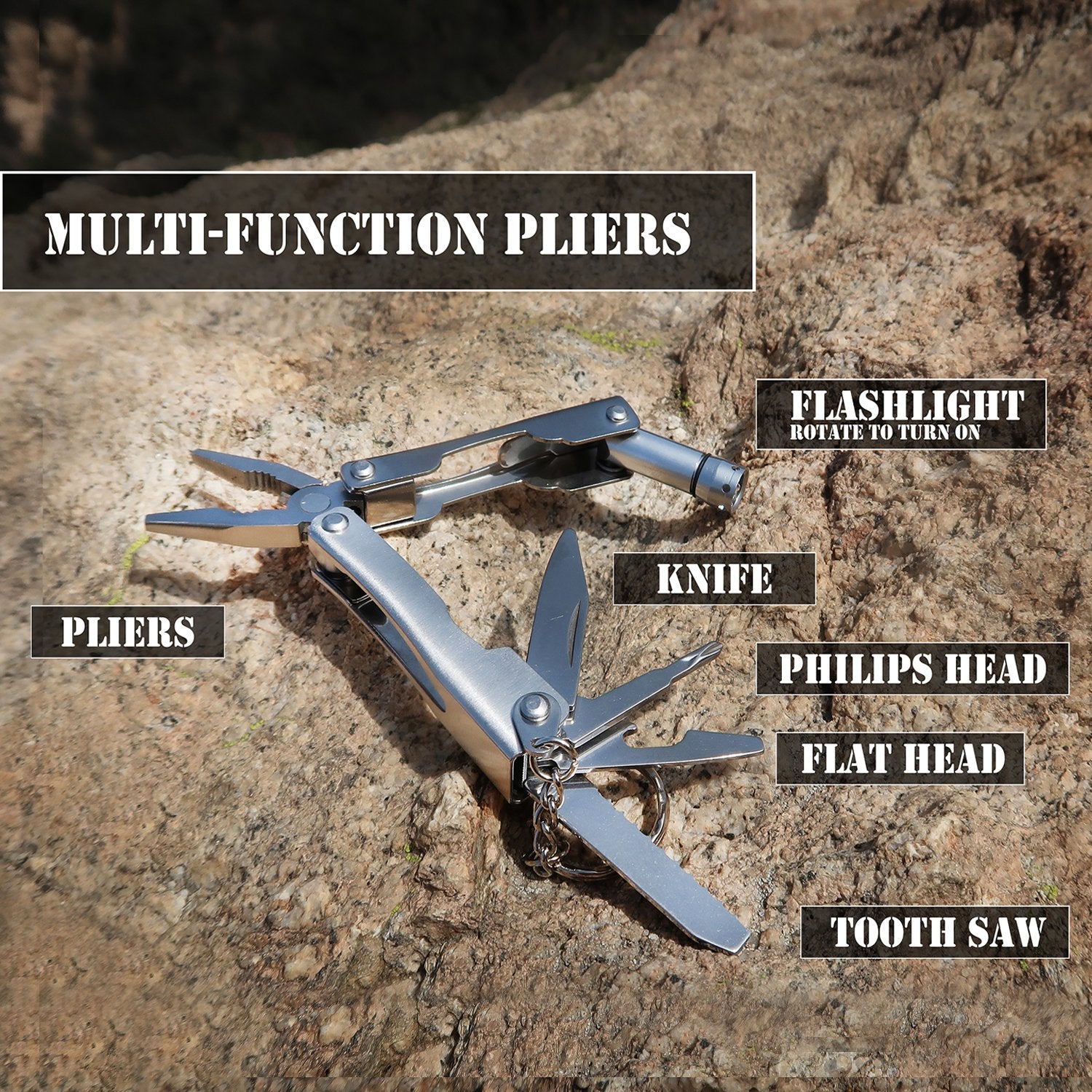 1X Multi-Function Pliers: Needle nose pliers, wire cutters, knife, saw, cross and slot screwdrivers, bottle opener, and a storage bag.