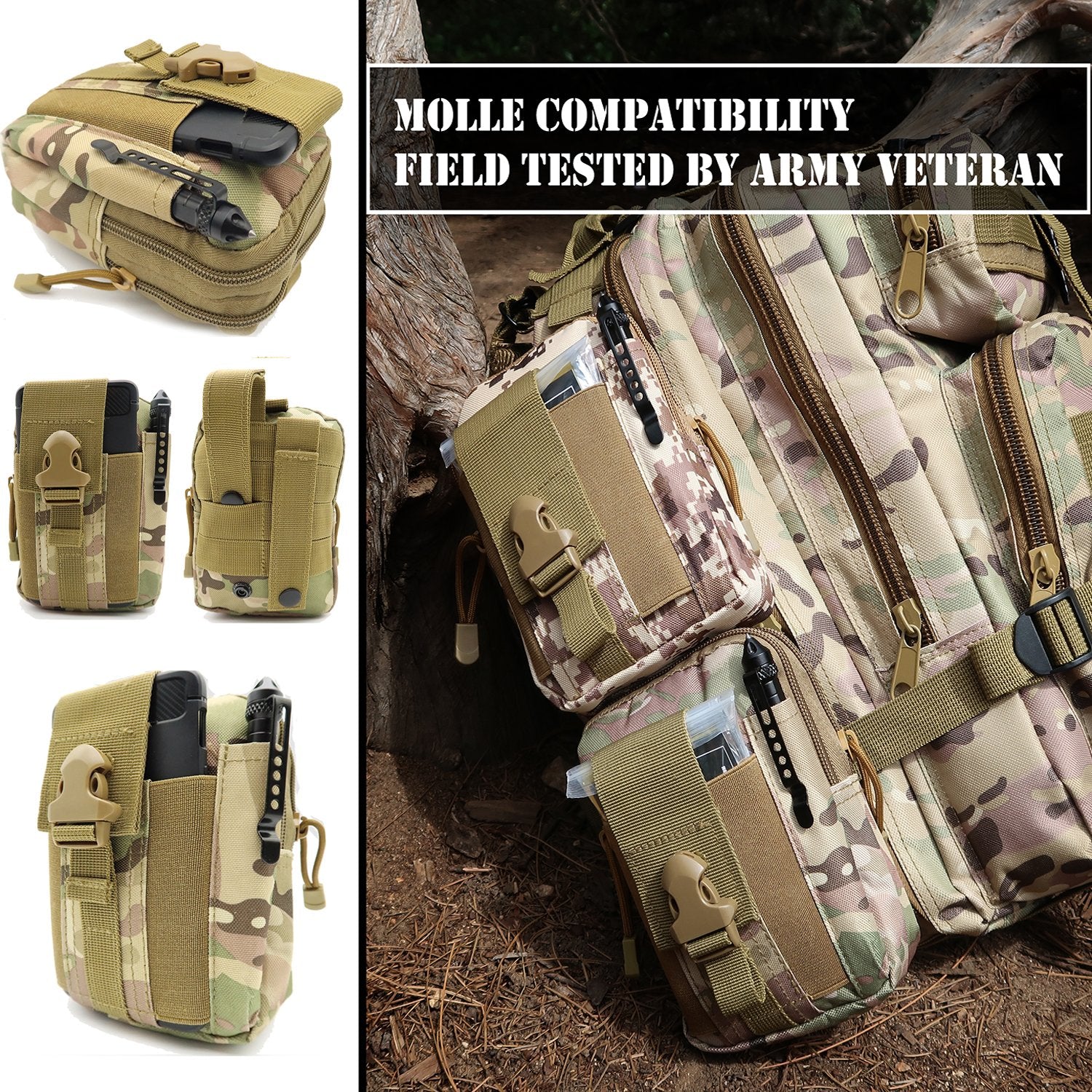 - ✅【Multi-Functional Molle Phone Pouch, Bracelet, Pliers, First Aid Kit】: The tactical molle tool bag/phone holster has 2 big zipped main compartments; 1 cell phone adjustable holds; 1 front penholder. It is compatible with MOST phones on the market: Iphone 7 plus, Galaxy S8, etc. The multi-functional paracord bracelet is featured with compass, flint fire starter, emergency whistle, scraper, and 10.5 FEET of paracord which can hold up to 400lb. The kit also contains a Mini First-Aid Kit that fulfi