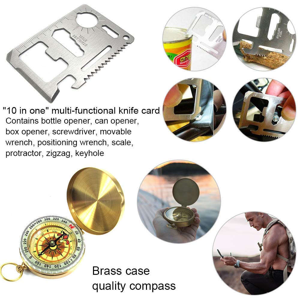 - 【PEACE OF MIND】- Nice variety of cool tools and gadgets has the essentials you need to feel secure when adventuring outdoors. Getting lost, needing a fire, cold or rainy conditions are no longer a problem when you have our life saving tools. Be prepared, be safe, This survival gear military tactical kit is all you need when the unexpected happens