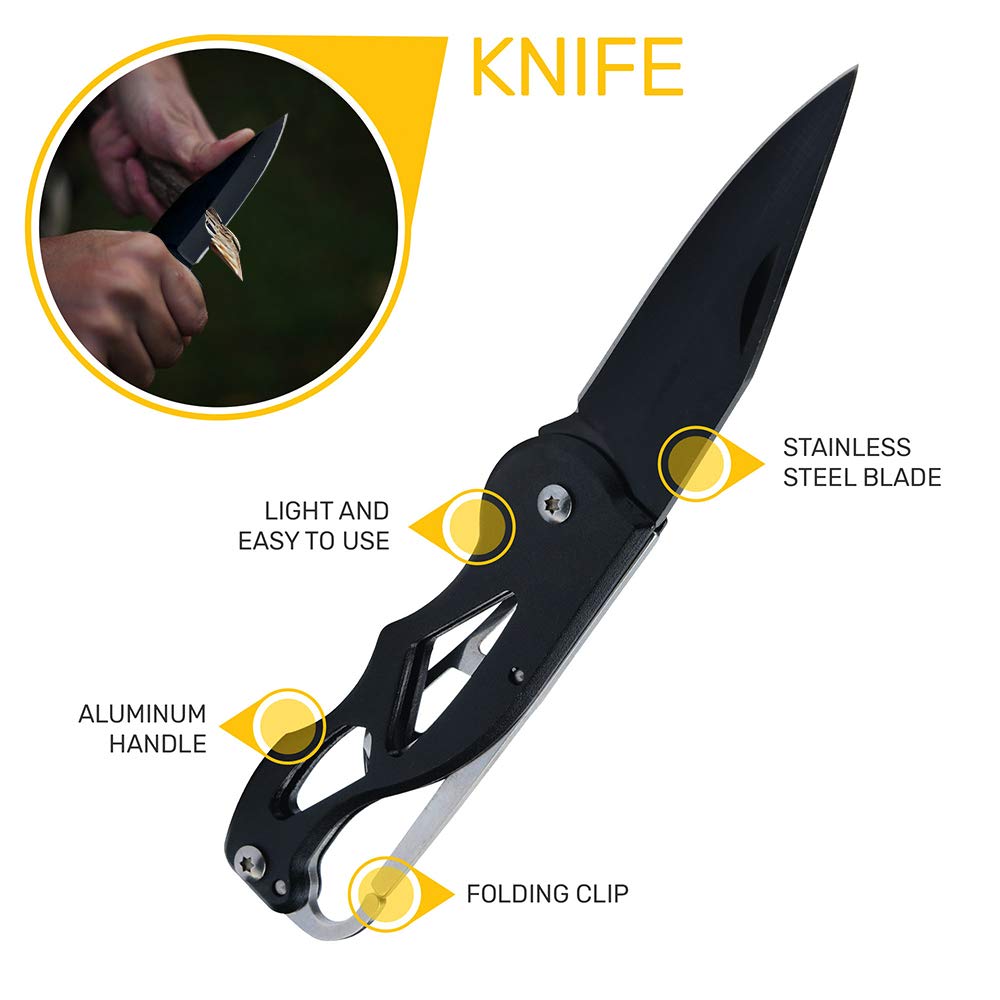 Made of high quality materials and carefully selected to cover all outdoor needs, your Survival Kit will be there for many adventures to come! Go explore the mountains, the woods and the entire world! As long as you take this kit, you are always prepared!