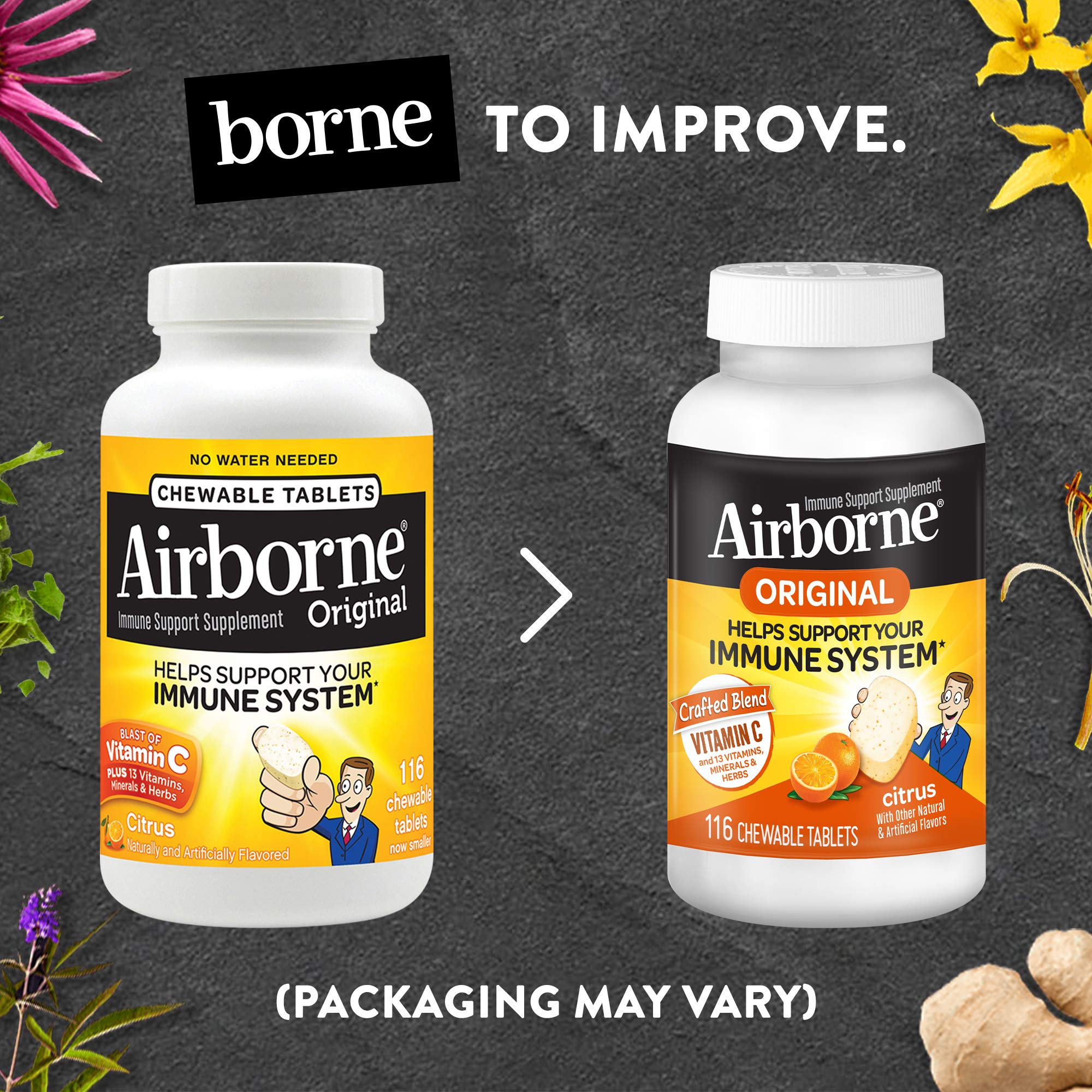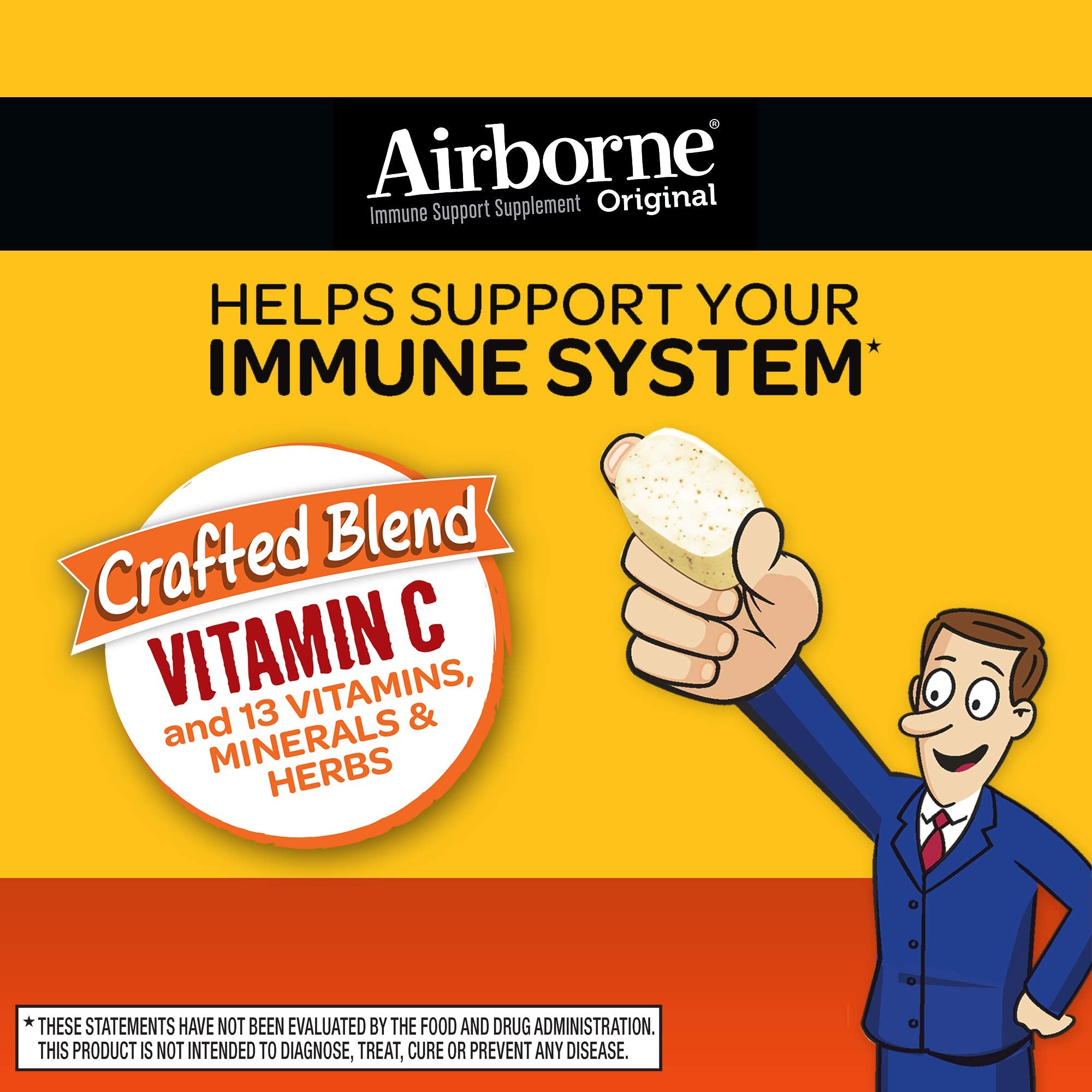 Details: Airborne Chewable Tablets provides immune support in a great-tasting and easy-to-take form; no water needed. Each serving (4 tablets) delivers a blast of 1000 mg of Vitamin C and 13 vitamins, minerals, and herbs, including Echinacea, and ginger.* Same immune support found in Airborne Effervescent Tablets and Gummies. Gluten Free. Visit AirborneHealth.com to learn more. *These Statements have not been evaluated by the Food and Drug Administration. This product is not intended to diagnose, treat, cure or prevent any disease.