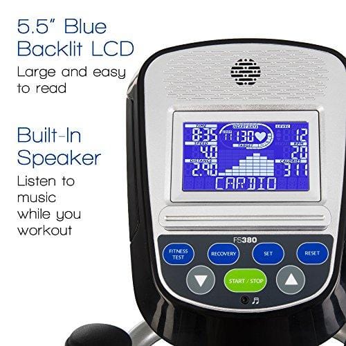 Keep track of your progress with the oversized 5.5” bright blue backlit LCD console window. It displays your program profile, time, speed, distance, heart rate, loop track, watts, resistance level, RPM, and calories, along with an alpha-numeric message center at the bottom of the screen. The FS380 provides 24 levels of resistance and a long list of motivating programs to keep you motivated and challenged regardless of your fitness level.