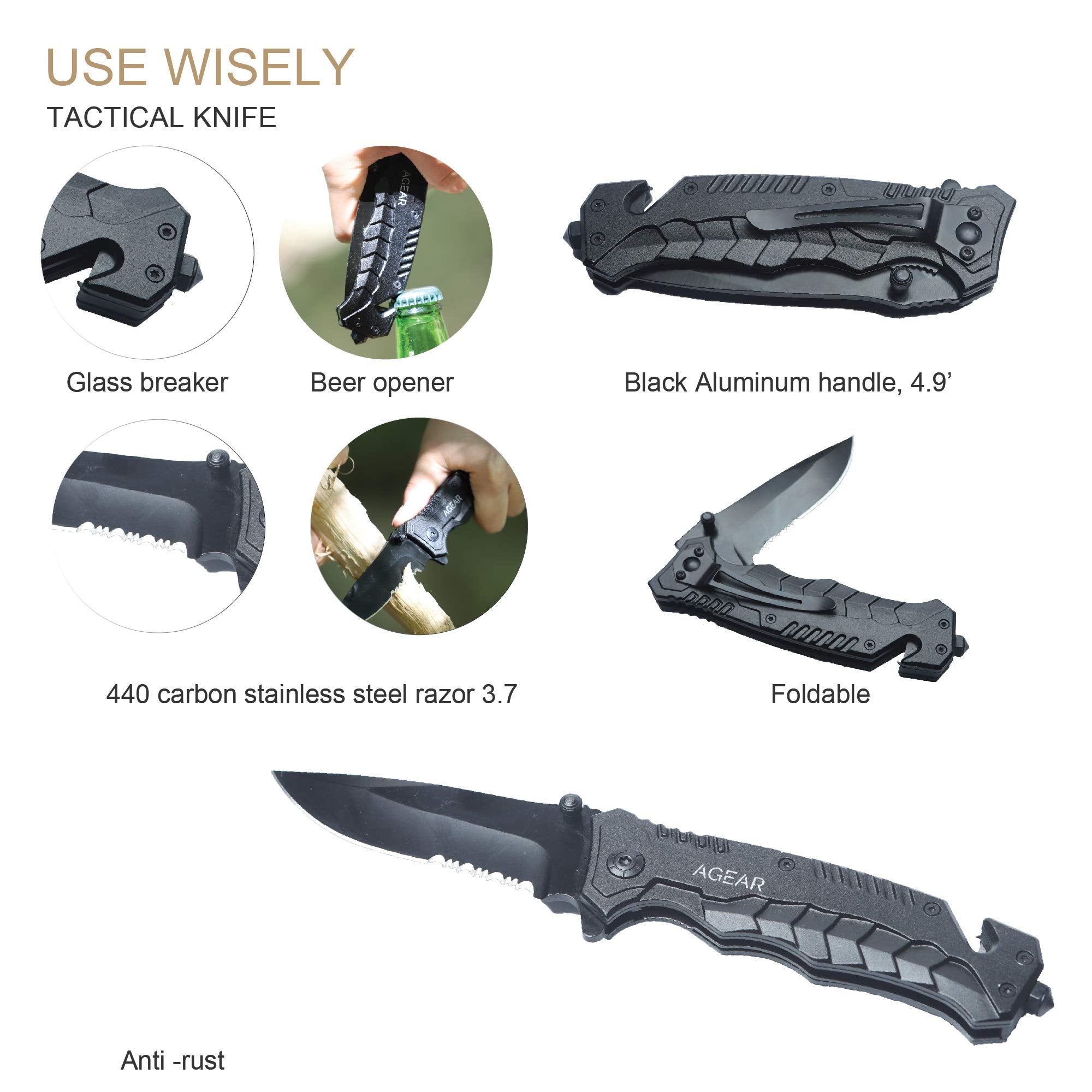 3. 3-in-1 Premium Folding Knife. Military rescue knife with the black 440 carbon stainless steel razor and black aluminum handle. This Swiss pocket knife is anti-rust and durable. Features a glass breaker and beer opener