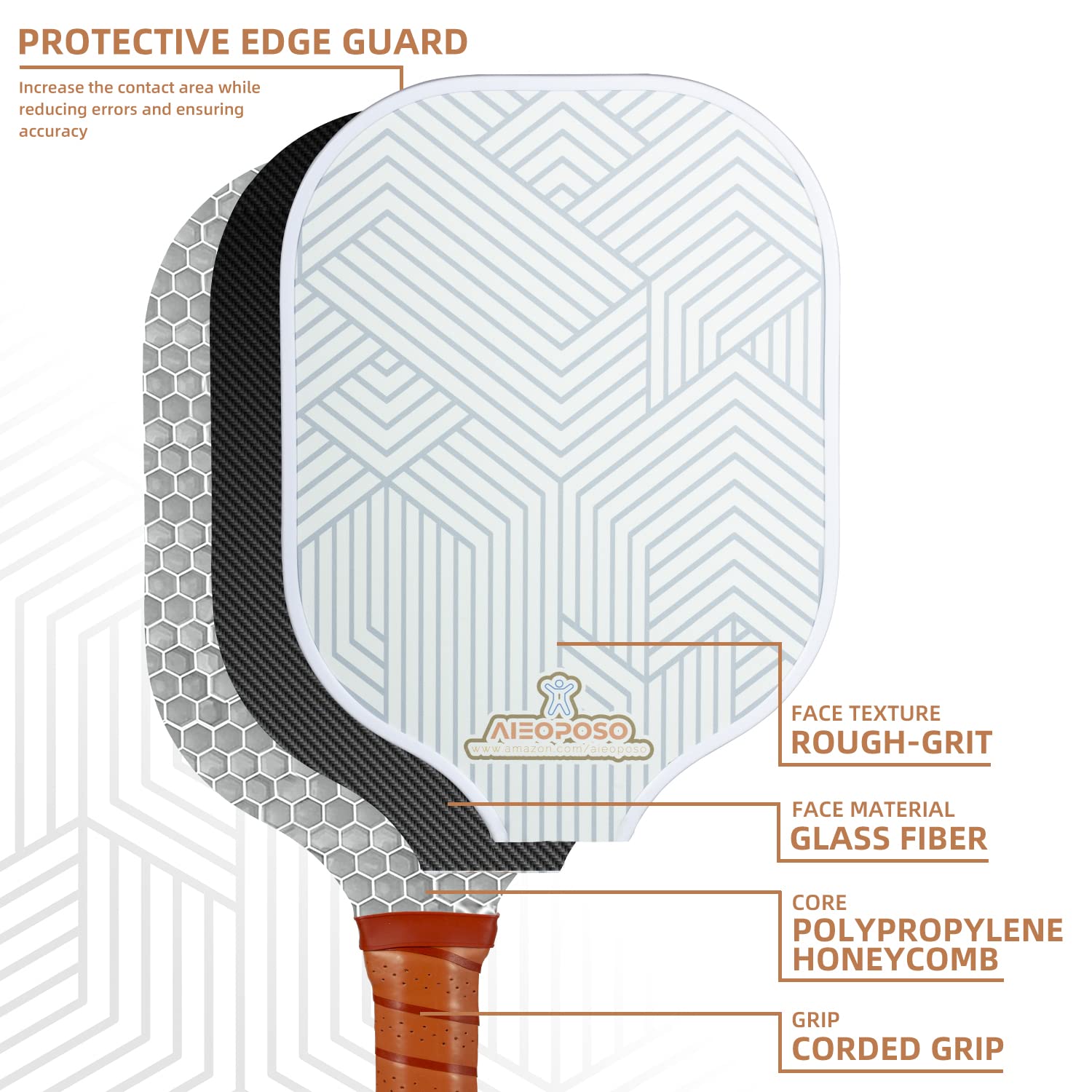 • ✅ A QUALITY YOU CAN TRUST – Unlike wooden pickleball paddles that are clumsy and offer less benefits, these fiberglass paddles are constructed with a high-quality graphite carbon fiber surface and honeycomb polypropylene core perfect for intermediate or new player who is getting used to controlling the pop and short shots. And the best part? – They have a protective edge guard to keep you safe and extends the lifespan of your investment.