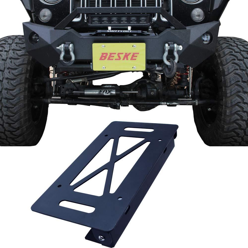 BESKE Flip-Up License Plate Holder for Winch Black Front License Plate Frame License Holder for Jeep Wrangler TJ YJ JK JKU JL