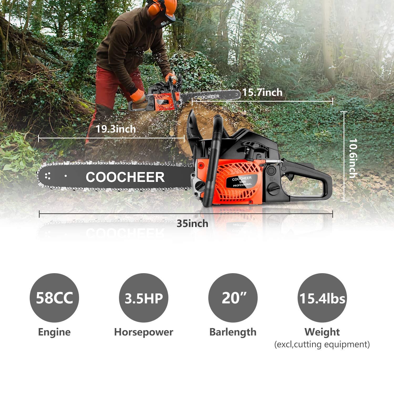 • POWERFUL& SOLID CHAINCHAW : 58CC full crank 2 cycle engine provides greater power and less vibration. 20-Inch wear-resistant sprocket tipped bar and chain cut through branches and wood with ease.
