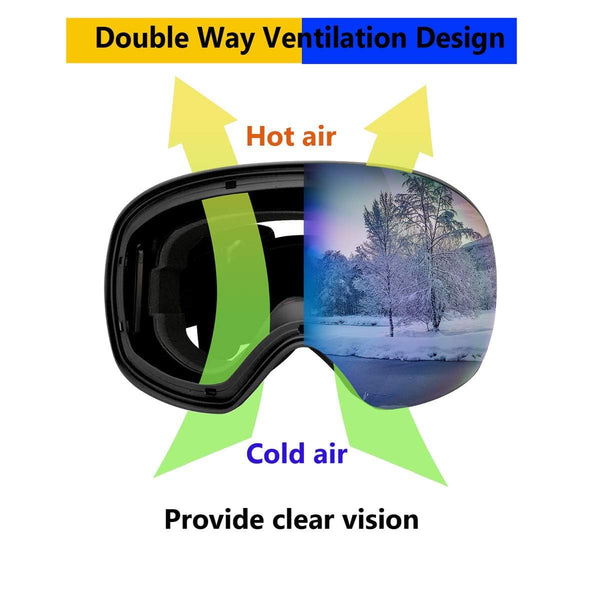 Designed to reduce fogging and optimizes the flowing air over the inside of the lens.Ski goggles provide smooth air-flow system which brings fresh air and exhaust moisture quickly and effectively. The big, spherical, frameless lens provides a truly unobstructed & clear view of the slopes.