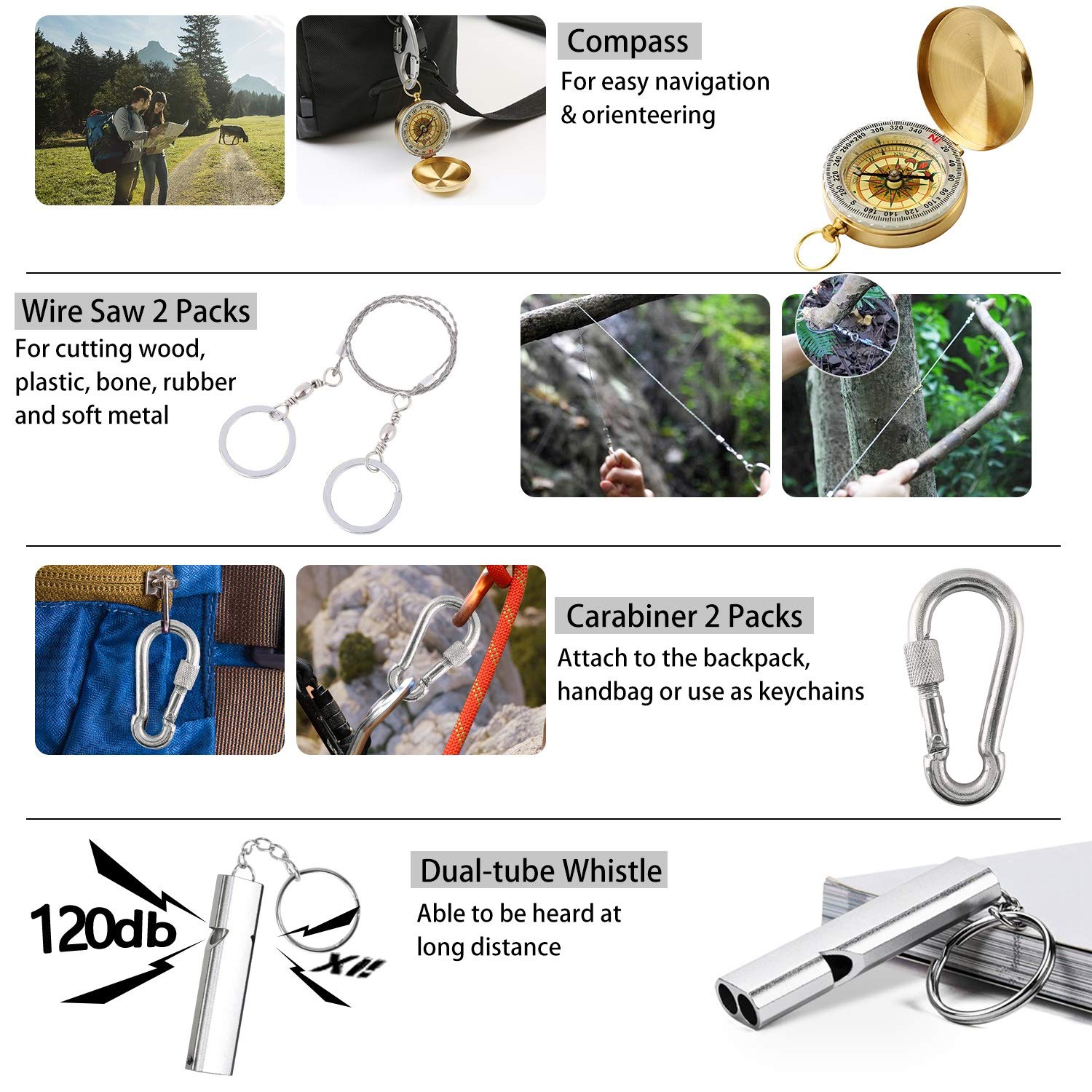 - MUST HAVE SURVIVAL KIT: CHAREADA 36 in 1 Upgraded survival gear kit includes 16pcs emergency survival kit 14pcs medical supplies and 6pcs fishing tools to better suit your needs. The all in one survival kit includes tactical folding knife, wire saw, flashlight, tactical defense pen, fire starter, compass, emergency blanket, folding pliers, whistle, saber card, bottle clip, carabiner, 6pcs fishing tools and 14 in 1 medkit, etc.