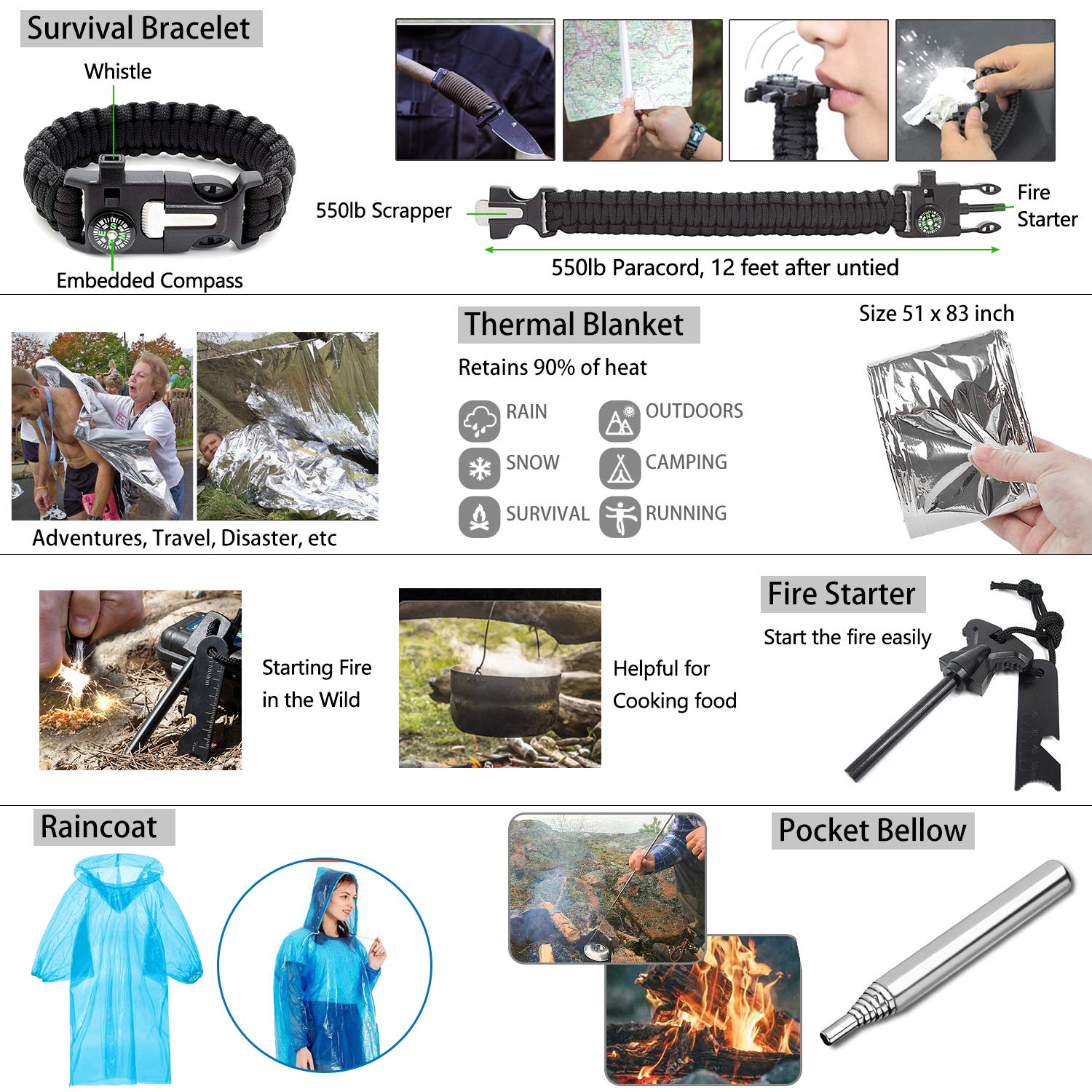 Emergency Survival Kit 47 in 1 Professional Survival Gear Tool First Aid Kit SOS Emergency Tactical Flashlight Knife Pliers Pen Blanket Bracelets Compass with Molle Pouch for Camping Adventures
