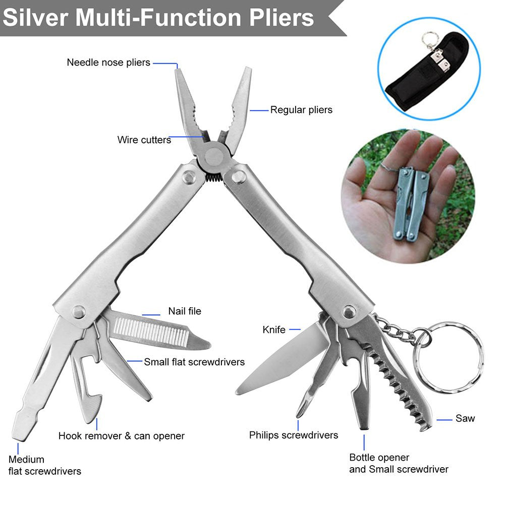 • ❖【Practical & Durable Multi-Funcion Tools】-- The Stainless Steel Saber Card With 11 Function, Can Opener, Knife Edge, Screwdriver, Ruler, Cap Opener, 4 Position Wrench, Butterfly Wrench, Saw Blade, Direction Ancillary Indication, 2 Position Wrench, A Key Ring Hole; Silver Multi-function Pliers Includes 11 Function Daily Home Furnishing Repair Tools, Needle Nose Pliers, Regular Pliers, Wire Cutters, Knife, Saw, Philips/Mediur Flat/Small Flat Screwdrivers, Hook Remover & Can Opener, Nail File.