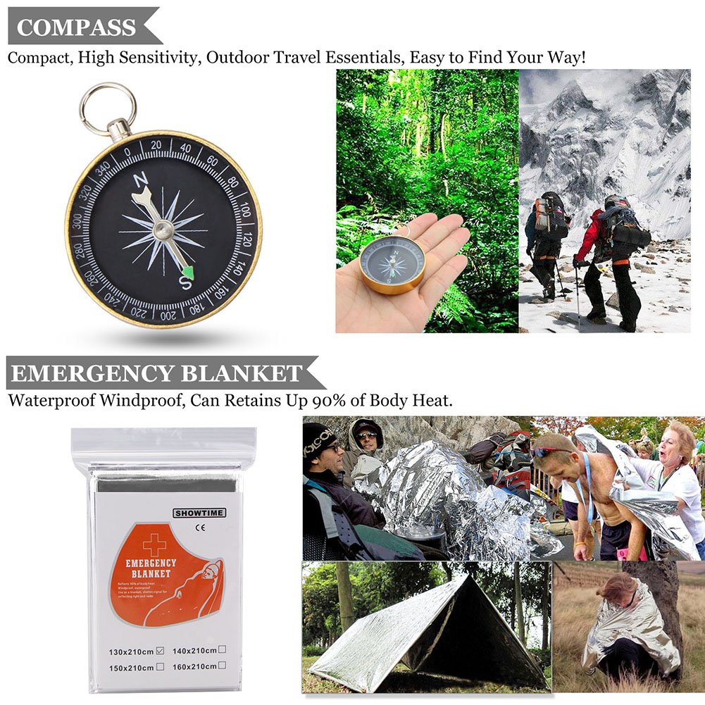 • ❖【High Quality Various Survival Tools】-- Army Green Whistle with Three Tubes High Frequency Design, Up to 120 dB, Loud Enough; Compass Compact, Flexible and High Sensitivity; Wire Saw Has Saw Blades Sharp and Smooth, Don't Hurt Hand and Can Cut Stuff and Pretty Quickly; Fire Starter is Easy To Use in Cold or Low Pressure Weather; Emergency Blankets Can Retains Up 90% of Body Heat, Waterproof and Windproof, Can Be Used As A Raincoat, Shelter, Ground Cover, Preventing Hypothermia Or Shock.