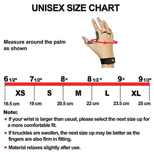 Sizing: Measure round the widest part of the palm, ABOVE THE THUMB AND BELOW THE LITTLE FINGER (NOT across the knuckles). That total measurement is the size you need fro the chart. Because of the stretchy fit, if you are in doubt, CHOOSE a BIGGER size rather than smaller size.