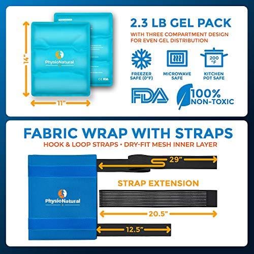 • EXTREMELY COMFORTABLE AND FITS ALL BODY PARTS - Our ONE-SIZE-FITS-ALL unique design includes a gel pad with fabric wrap to give you a more comfortable and SOFTER TOUCH, Elastic straps that can be easily adjusted to keep the pouch in place, and an EXTRA-LARGE WRAP that assures a PERFECT FIT for any body part. The pad COVERS LARGE AREAS such as your shoulders, back, hips, knees and various joints. With PhysioNatural gel ice pack and wrap you can LAY BACK AND LET IT DO THE WORK FOR YOU.