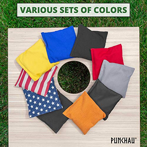 Punchau's durable cornhole bags are designed to last. Strong stitching and tough duck cloth ensure these bags won't burst open during play.Filled with sand to handle all weather types.