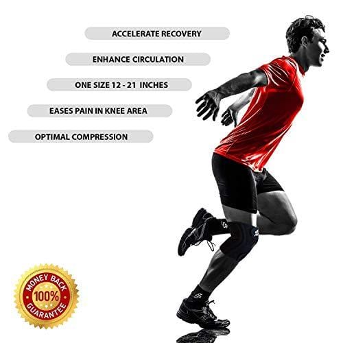 • ✅ QUALITY MEETS COMFORT: Made from high-end quality neoprene you may rest assured that this knee sleeve is ready for some heavy duty use. Thanks to its breathable and moisture wicking fabric, and dual side stabilizers for ultimate protection, this knee brace will provide optimal support and endless comfort while wearing. Enjoy better range of motion and enhance your movement. Perfect knee braces for women, men and kids with knee injuries, pains or arthritis! Fits knees between 12 - 21 inches.