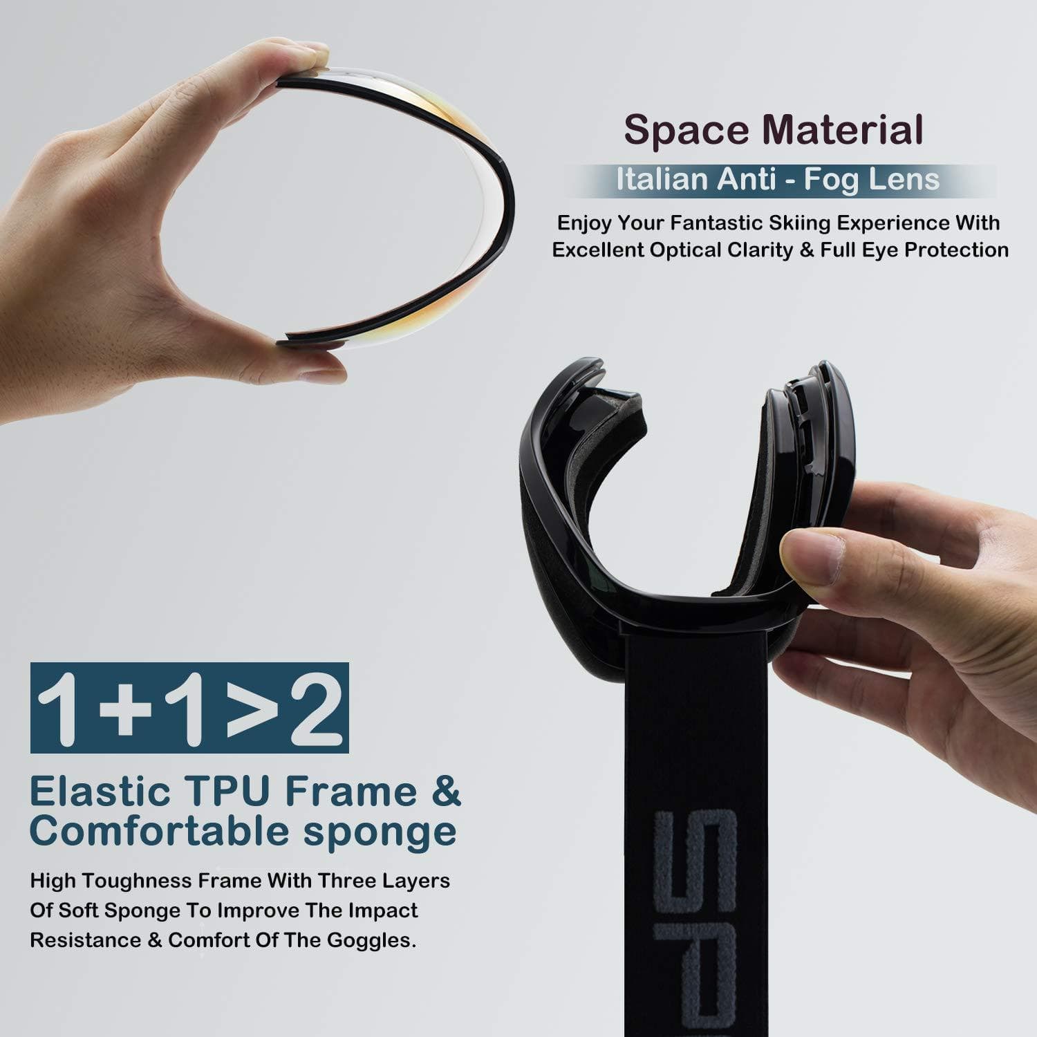 - 【Ventilation system】 Designed to reduce fogging and optimizes the flowing air over the inside of the lens. ski goggles provide smooth air-flow system which brings fresh air and exhaust moisture quickly and effectively when you are skiing.