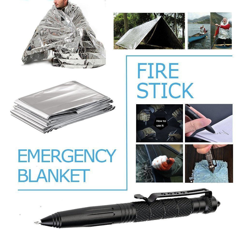 - New upgrade combo: 13-in-1 survival kit. The whole package includes: Compass, 11-in 1 Multi-tool, Wire Saw, Water Bottle Clip, Emergency Blanket, Flint Stone, Survival Knife, Flashlight, Tactical Pen, Whistle, Mini Light and a Black Waterproof Box