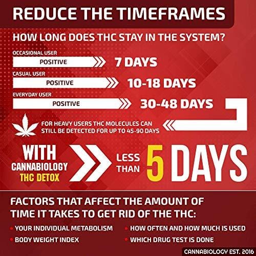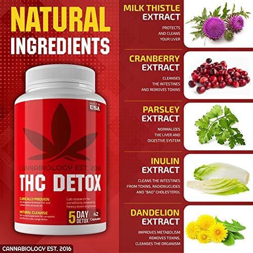 - WIDE-RANGE TOXIN DETOX - With Cannabiology it would take you 5 DAYS to become 100% THC-FREE! CLINICALLY-TESTED EFFICACY to reduce the timeframes! Provides 4 major factors of FULL SYSTEM CLEANSING including circulatory, digestive & urinary systems as well as restorative health processes.