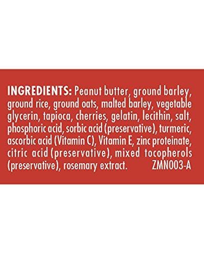 Peanut butter, ground barley, ground rice, ground oats, malted barley, vegetable glycerin, tapioca, cherries, gelatin, lecithin, salt, phosphoric acid, sorbic acid (preservative), turmeric, ascorbic acid (Vitamin C), Vitamin E supplement, zinc proteinate, citric acid (preservative), mixed tocopherols (preservative), rosemary extract.